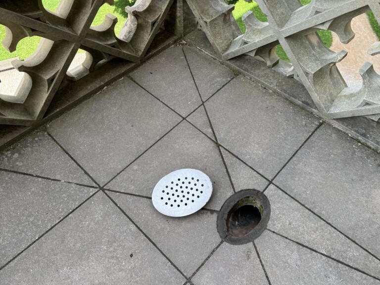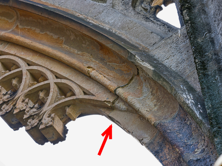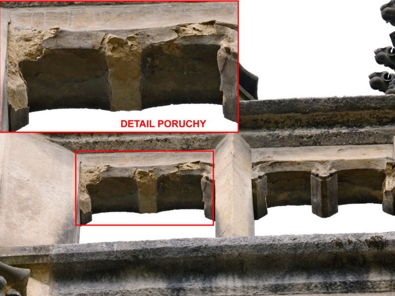 V západní části průčelí chrámu byla zjištěna závažná porucha pískovcové dlažby na venkovním balkónu, kudy dešťová voda zatékala do depozitáře s historickými artefakty. Poškození způsobila nevhodná skladba povrchu z předchozí rekonstrukce. Projekt opravy, který připravil Ing. Petr Rohlíček, zahrnuje odstranění stávající dlažby, novou hydroizolaci, pokládku nové pískovcové dlažby a opravu poškozených omítek v depozitáři.