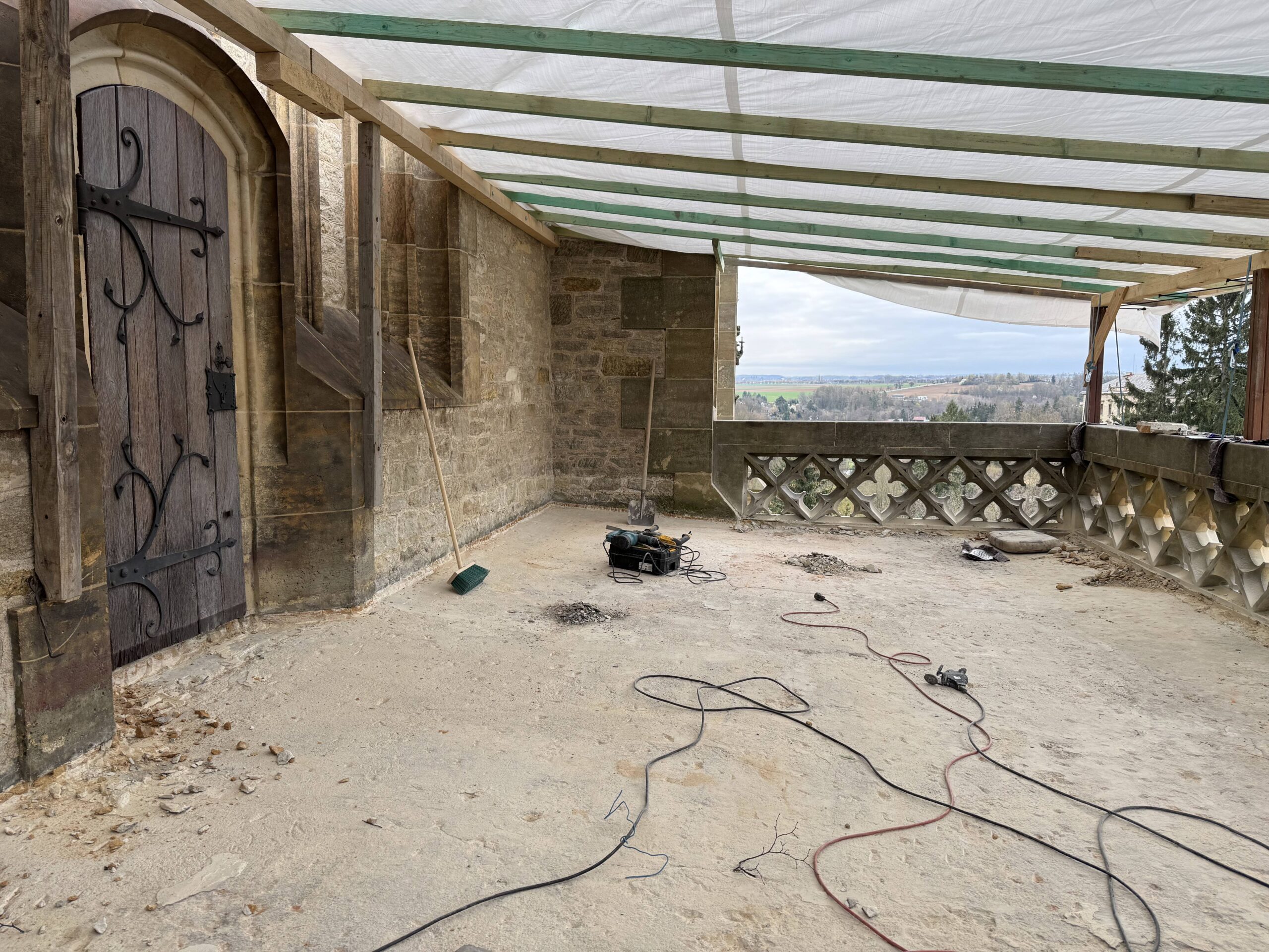 První etapa proběhla na jaře roku 2025 a zahrnovala obnovu podlahy terasy včetně nové hydroizolace, položení pískovcové dlažby na podkladní terče a osazení mosazné lišty po celém obvodu. K 21. květnu 2025 byly práce dokončeny. Celkové náklady první etapy se vyšplhaly na 1 468 238 Kč. Na projekt se podařilo získat dotace ve výši 1 085 800 Kč.